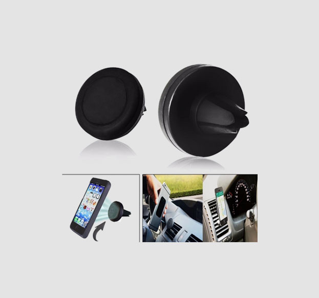 Suporte veicular magnético com quatro imãs de alta imantação e garra de encaixe. Acompanha duas fichas metálicas.